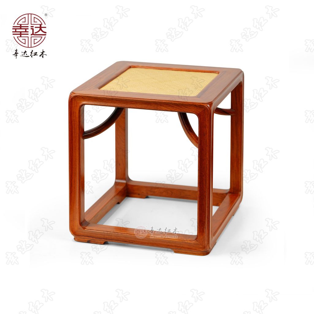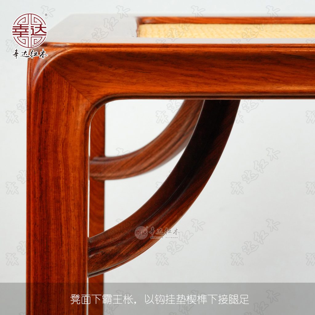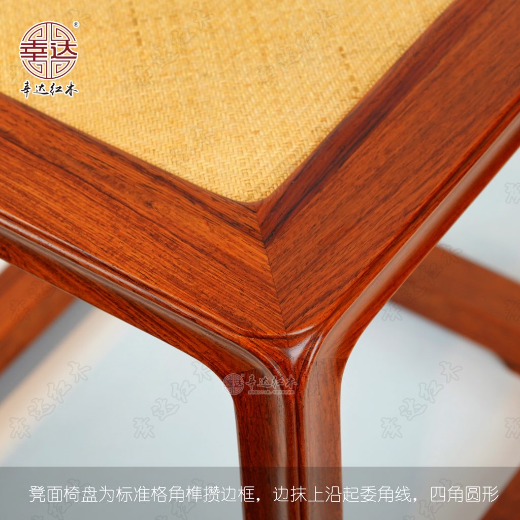凳面椅盘为标准格角榫攒边框,下有二根托带支承。四框内缘踩边打眼造软屉。边抹上沿起委角线,四角圆形。腿足端以粽角榫与椅盘和托泥相接,菱形一弯霸王枨,以钩挂垫楔榫下接腿足,上连托带。边抹立面、腿足与托泥均打洼踩委角线。托泥四角下安矮垫足。