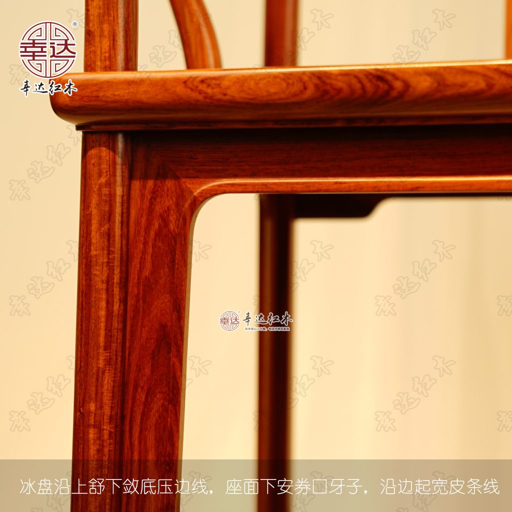 此对椅子全身光素,只在椅盘下起窄边线和前牙子压皮条线,令其特高靠背如雕像般分外着眼。靠背板木纹状如旋转圆窝,尽显木纹美态。