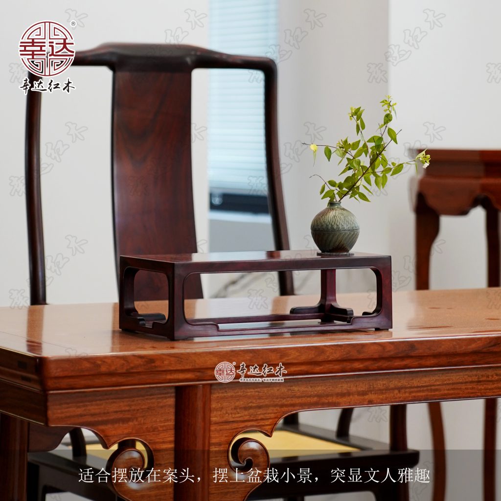 紫檀则以其沉稳厚重的气质,成为明式家具中的高端材质。紫檀木质地坚硬致密,色泽呈深紫色,纹理细腻如缎,光泽温润,手感沉重。由于紫檀木纹理细密,不易变形,非常适合雕刻与打磨,常用于制作高端家具与工艺品。明式紫檀家具多以光素为主,凸显材质本身的质感,尽显庄重典雅。